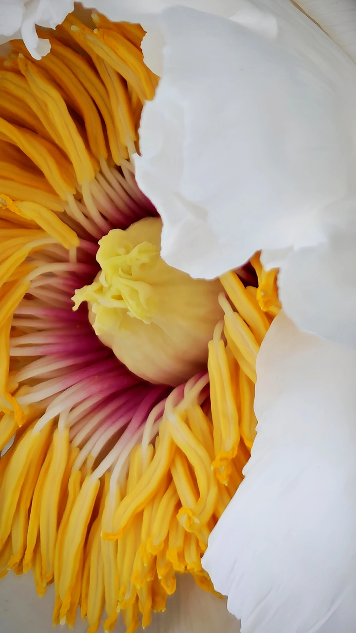不愧是我们的国花牡丹,瞧瞧它的花蕊都这么有风范!一瓣白、一缕金,于甜香柔甘里,看花蕊才知道牡丹的精巧!