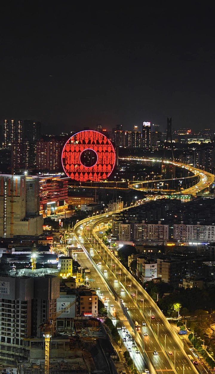 广州圆/铜钱大厦位于广东省广州市荔湾区白鹅潭经济圈的南边,是意大利建筑师约瑟夫·迪·帕斯卡利(Joseph DiPasquale)设计构思。建筑造型以圆形为主体,灵感来源于古代玉璧与铜钱的意象,兼具传统寓意与现代视觉表现。 每到晚上这个建筑就会亮出不同颜色的灯光,照耀着这座不夜城。道路和车流构筑了夜空里最美丽的风景线。