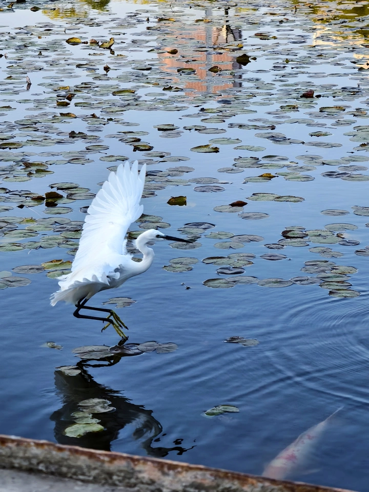 南方的冬日来得晚,荷塘依旧褪去了盛夏的繁闹。水面上的残叶还凝着微凉的水汽,一只白鹭却突然振翅而来。它的白羽在淡蓝的水波上划出一道亮眼的弧,细长的腿轻点莲叶,蹼尖刚触到水面,便惊起一圈圈细碎的涟漪。鱼影在水下倏忽闪过,鹭鸟的长喙精准追向那抹灵动,这一刻,自然的生趣就藏在这转瞬的掠水瞬间里,荷塘的静与白鹭的动,凑成了最鲜活的秋日画面。
