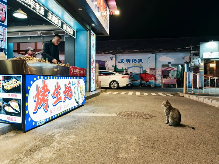 烤生蚝的烟火滋滋作响,暖黄的灯光裹着海鲜的鲜香,在微凉的夜里漫开。一只花猫蹲在路中央,不吵不闹,像个沉默的食客,静静守着属于它的夜市时间。 能让猫咪等待的摊位,说明菜的味道一定不差,老板心眼也好。