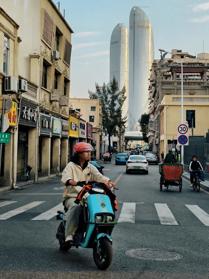 骑楼的影子被夕阳拉得老长,双子塔像两柄银色的剑,斜斜插进暮色里。 红盔少年拧动电门,蓝色的小电驴便轻巧地滑过斑马线。路过半开的糖水铺,混着烟火气的风灌进衣摆,身后是现代地标冷峻的线条,眼前是老街暖黄的灯牌。 他不赶时间,只是恰好路过这场旧时光与新未来的相遇。在厦门的黄昏里,他自己就是最鲜活的帧。