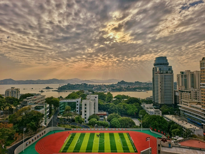 站在高处,刚好接住厦门的晚光。天空铺了一层鳞次栉比的云,阳光像融化的蜜,从云缝里淌下来,给海面镀上温柔的暖金。 红跑道、绿草坪的球场在眼前铺开,鲜活得像一块刚切开的水果糖。远处的鼓浪屿在薄雾里舒展,老建筑与新楼宇错落相依,风里裹着湿润的海气,混着草木的清香。 这是独属于厦门的浪漫——市井烟火与山海辽阔在此刻交融,连空气里都飘着松弛的节奏。