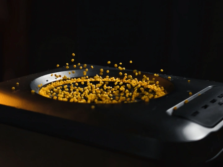 当声波穿过寂静,那些沉睡的精灵突然清醒。他们从黑色的圆盘中央跃起。像被唤醒的星子,在幽暗中划出金色的弧线。 有的颗粒垂直飞升,带着决绝的勇气;有的则在半空迟疑画出温柔的抛物线;更多的小不点在震动中雀跃,彼此碰撞,又迅速弹开,仿佛在跳一支无声的踢踏舞。黑色的底盘是他们的舞台,而声波是无形的指挥家,用看不见的手,编排着这场微观世界的芭蕾。 这些跃动的光点,让我想起深夜耳机里鼓点的脉搏,想起爱人说话时音调的起伏高低--原来,那些我们习以为常的声音,都内藏着如此惊心动魄的舞蹈。当最后一粒尘埃落定,寂静回归,空气里仍残留着震动的余温,像一首未完成的诗。