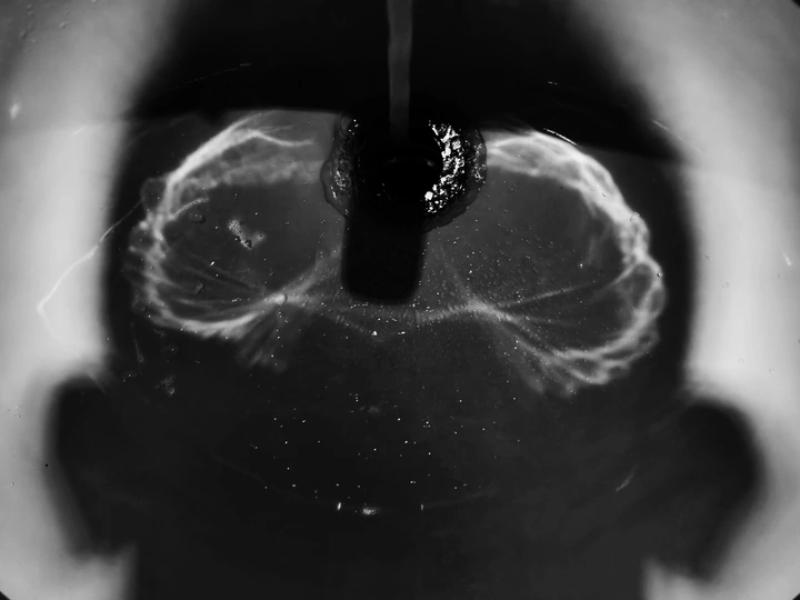 黑白的底片上,光晕漫延成大脑的模样。 这是一场关于“填充”的实验,我们总以为思维可以像容器一样被灌满,却忽略了每一次注入,都会漾开新的纹路。黑白之间,流动的不只是水,还有那些被我们强行塞进脑海里的念头,在摇晃中慢慢晕开形状。