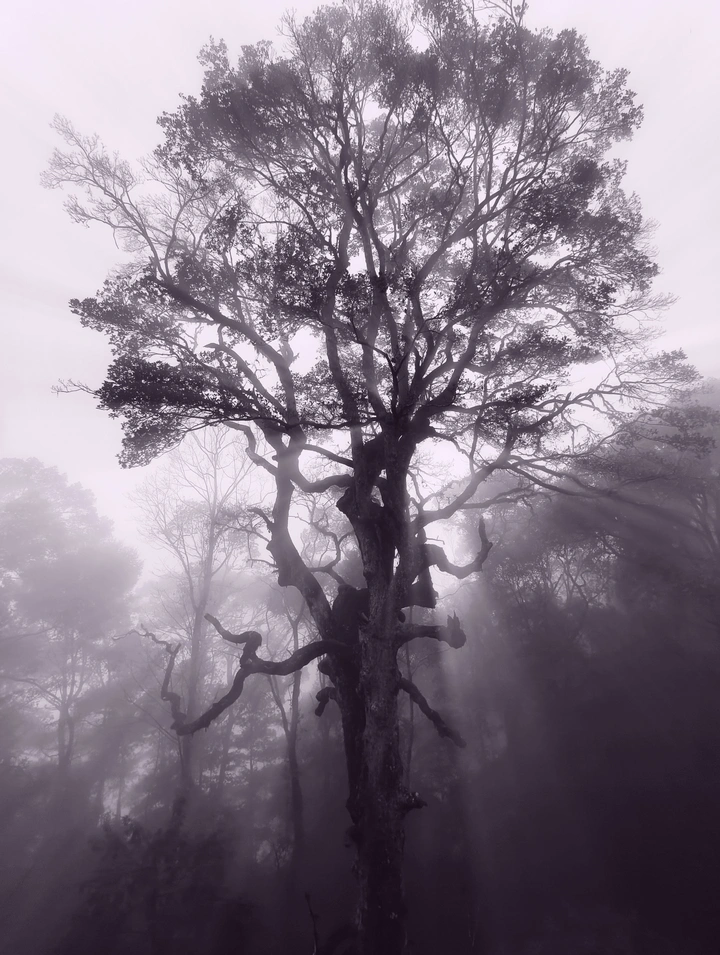 老山民都说,这雾是它吐的息。 没人说得清它活了多久,只知道进山的采药人若在雾里听见枝桠轻响,就得立刻折返——那是它在数路过的影子。 今天的雾比往常更沉,它把阳光拧成一缕缕金线垂下来,像在织一张温柔的网。 你若抬头撞见它的枝桠在雾里晃动,别慌,它只是想借你的影子,再看一眼人间的烟火。