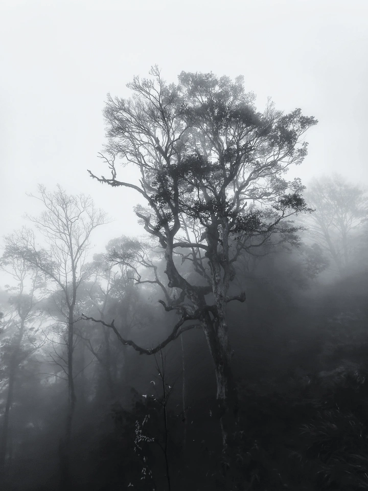 山雾漫上来时,我正走在无人的林径里。眼前的老树突然从白絮里浮出来,枝桠像伸开的手掌,要接住所有迷路的云。 远处的林影在雾里飘着,像谁遗落的旧梦。我站在原地,听着自己的呼吸混进潮湿的风里,忽然明白——有些相遇,只该发生在雾里。