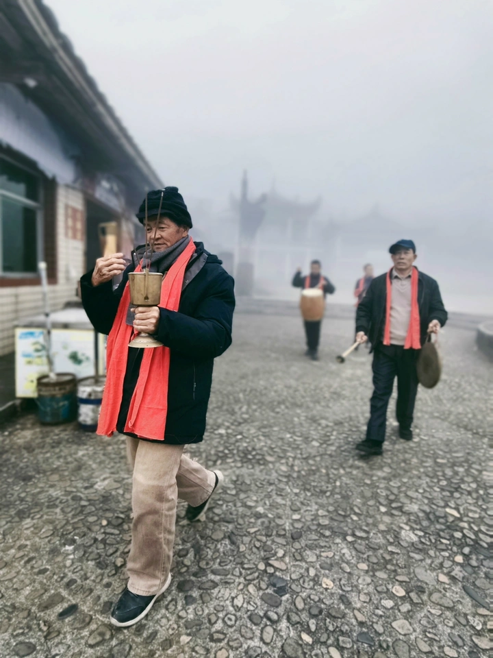 雾锁石牛山,红绸系在老棉袄的领口。 鼓点敲碎山雾,烟火气混着松香漫开。我们走在青石板上,脚步踏得比鼓点更沉。 这不是一场表演,是山里人最虔诚的仪式。红绸在雾里飘着,像要把天上的神,牵回这方烟火人间。