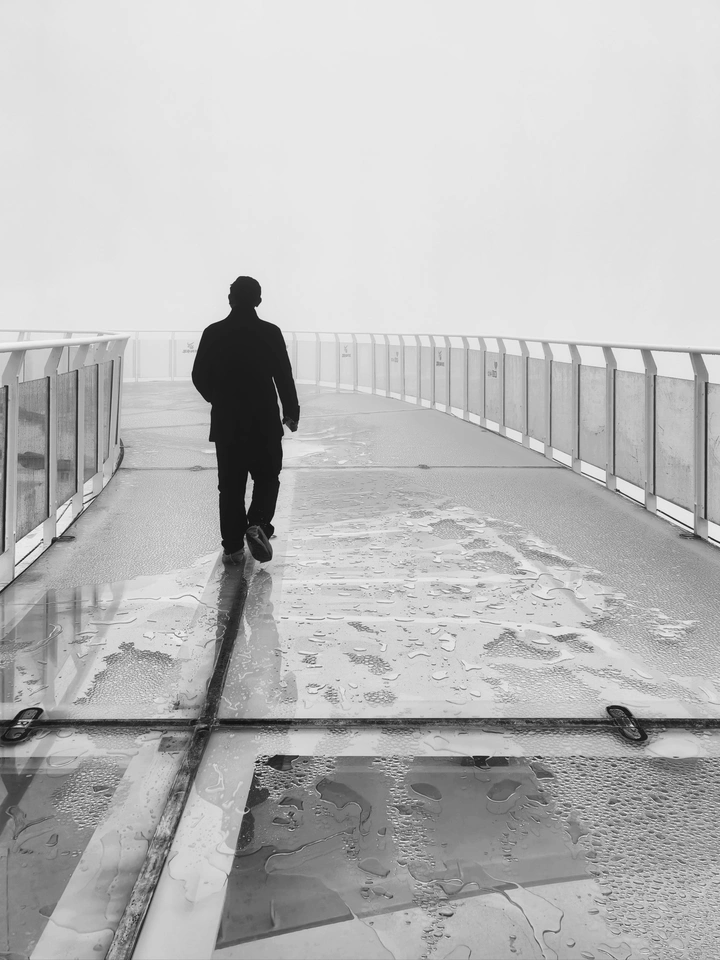 大雾天,整座观景台都成了孤独的容器。 有人在机械臂下守着一方光影沉默,有人在湿滑的玻璃栈道上走向白茫茫的未知。能见度不足十米,我们看不清远方,看不到景色,只能在浓雾中迷茫。 下山后雾渐散,回望这名为“天空之心”的景点,原来它是那么美,它是那么的险,它是那么的壮观。不能感受到这些,只是因为视野太小了。