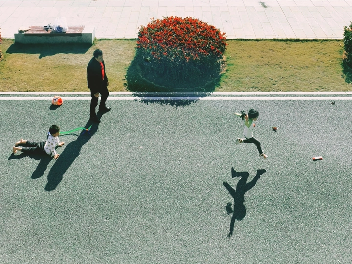 “快看!我的影子飞起来啦!” 小女孩清脆的笑声撞进正午的阳光里,她踮着脚往前奔跑,影子就真的跟着在路面上“飞”了起来,又轻又快。 一旁的弟弟趴在地上,看着姐姐飞跃的身姿,影子便赖在地上,和他一起耍赖。 爸爸的影子不紧不慢地跟在后面,像一座稳稳的小山。 风掠过耳边,阳光暖得发烫,童年的快乐就是这么简单——只要跑起来,连影子都能长出翅膀。