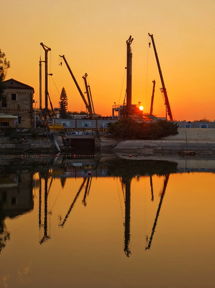 当落日把最后一捧熔金泼向水面,塔吊与钻机的钢铁骨架便在橙红的幕布上,站成了最沉默的诗行。 旧石屋守着岸边的余温,倒影在镜面似的水里与新城市的筋骨交叠。 没有轰鸣,只有晚风与水波轻响。 这一刻,坚硬的机械也染上了温柔的光晕,像在与整座城一起,等待下一个天亮。