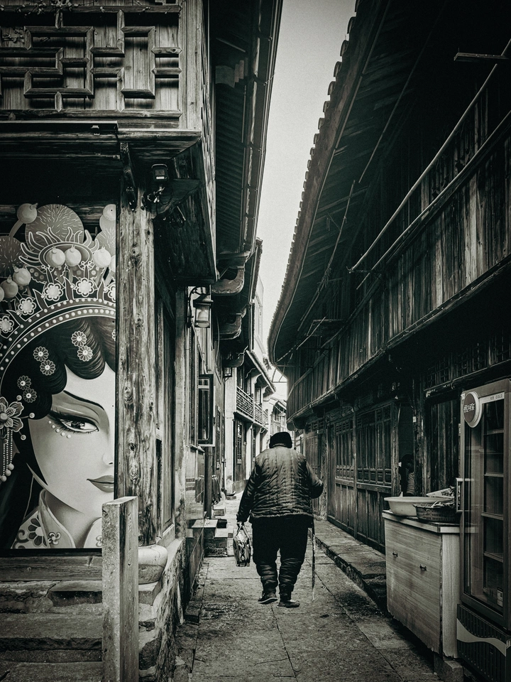 青石板路刻着岁月的纹路, 木构老楼藏着江南的余温。 一侧是戏文里的眉眼流转, 一侧是烟火里的步履蹒跚。 黑白滤镜滤去了喧嚣, 却让时光的对话,在巷弄里愈发清晰。 这是老巷的记忆,也是人间的烟火。