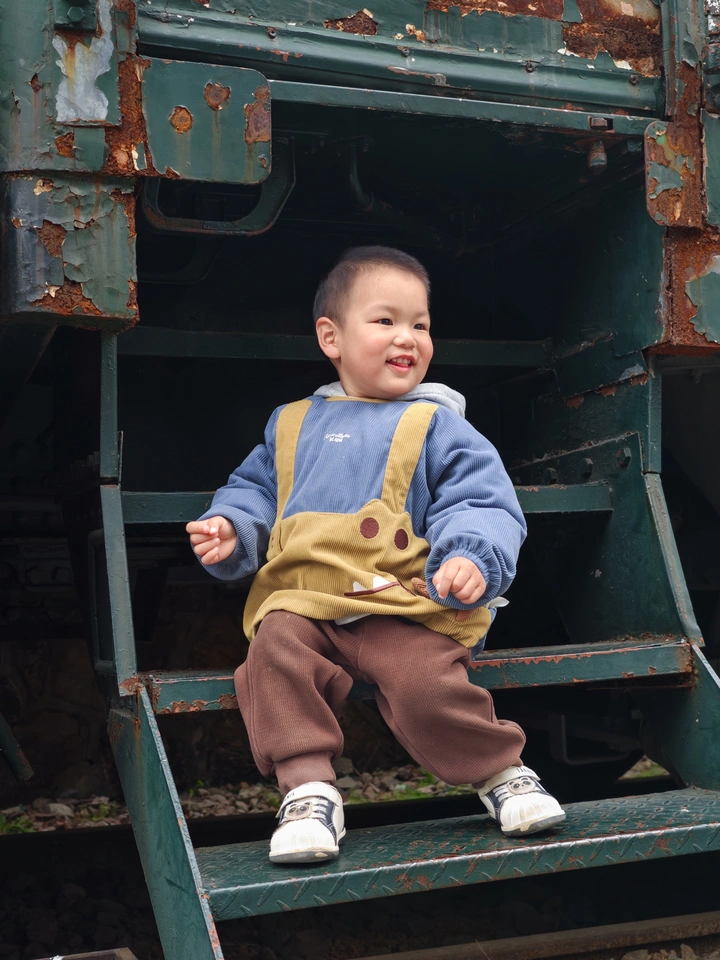 镜头对准旧火车的金属楼梯,捕捉宝贝最松弛的瞬间✨ 没有刻意的摆拍,只有自然的嬉笑与灵动的神态。 斑驳的锈迹是时光的底色,蓝黄相间的穿搭撞出鲜活的童趣。 每一帧都是不加修饰的童真,是童年最珍贵的原生模样。 用镜头定格这份质朴的美好,愿宝贝自在生长,眼里永远有光?
