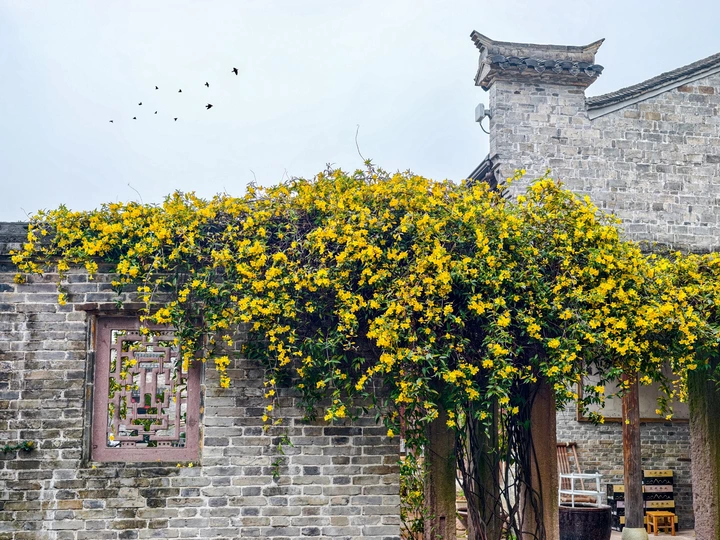 青砖黛瓦间,黄素馨顺着古墙肆意生长,把一整个春天都揉成了满枝金黄。 石窗漏下的光影里,每一朵小黄花都在风里轻晃,像古院藏了一整个春天的温柔。 镜头定格的,不只是花开的瞬间,更是岁月与春光撞个满怀的浪漫。 用一墙金黄,赴一场春日的旧约。 特意用古窗做框架构图,突出黄花的灵动;用大场景展现花墙的盛景,特写捕捉细节,一远一近,完整呈现春日古院的美 #米拍创作 #古建摄影 #春日花卉 #黄素馨 #宁波春日 #植物摄影 #春天的颜色