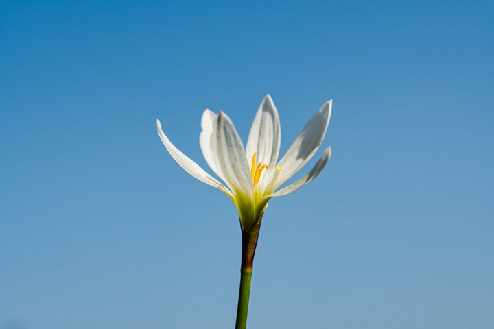 在阳光的映射下,葱莲露出她橘黄的花蕊被白色的花瓣衬托中心,面向着蓝天