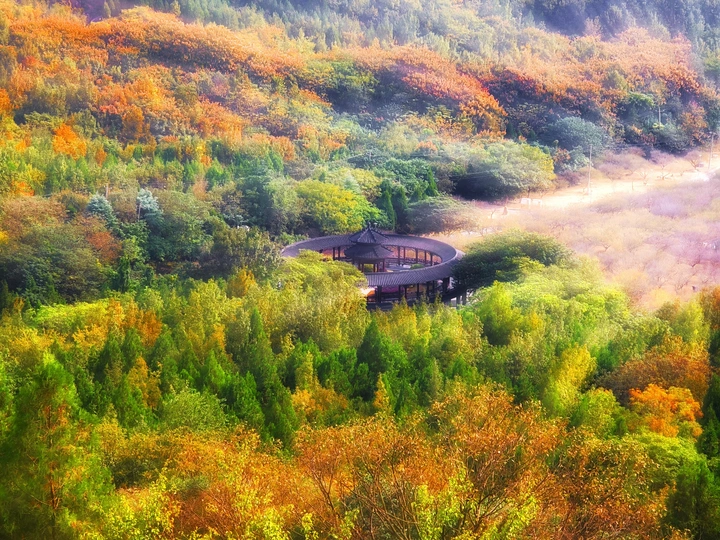 被五彩斑斓的树包围着,好不好看不知道,不过我知道的是这个小亭一定很凉快