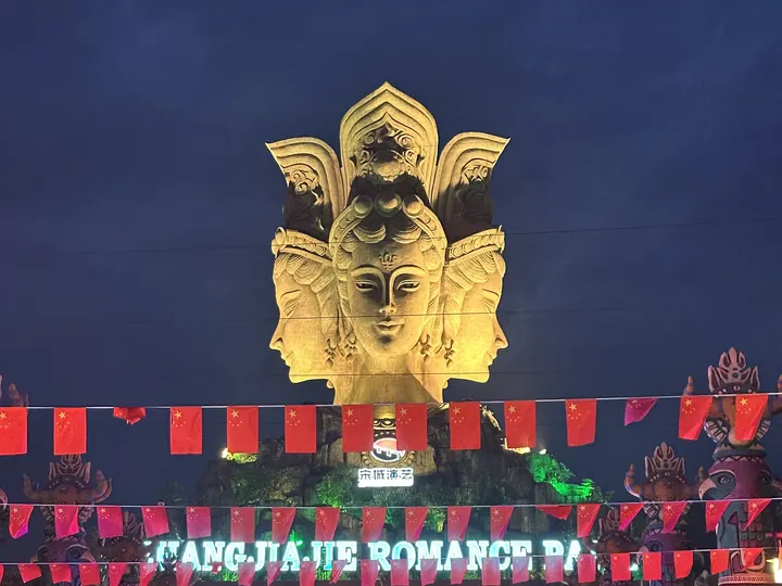 夜色里的张家界千古情,雕像在光影中似有灵韵,满挂的国旗红得热烈。仿佛历史与当下在此交融,既见艺术之美,又触家国深情,每一处都藏着故事与感动。