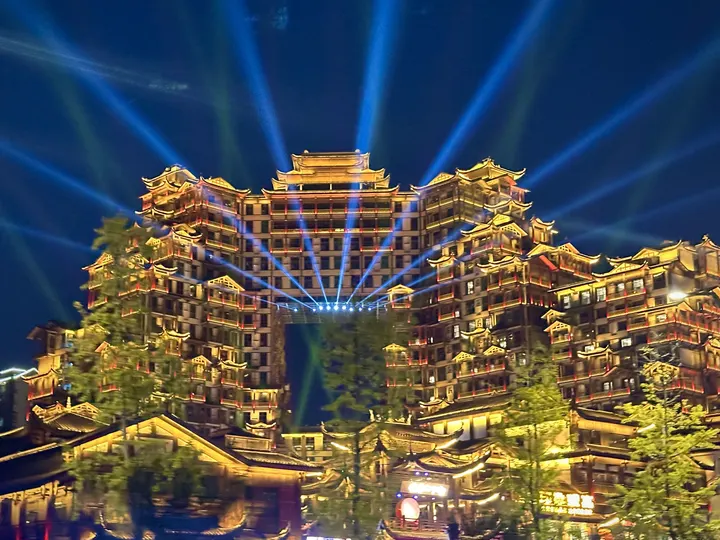 夜色如墨 这座仿若从古风画卷中走出的建筑被暖黄灯火层层点亮 古典建筑与现代光影碰撞出极致浪漫 蓝紫光束如星河倾泻 每一处雕栏每一道射线 都编织出独属于这里的奇幻梦境 仿佛踏入了时空交错的秘境