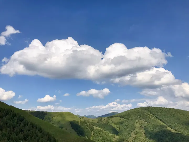 澄澈的蓝天,一朵心型云轻轻悬在山尖,像给青黛色的山峦别了枚柔软的徽章。
