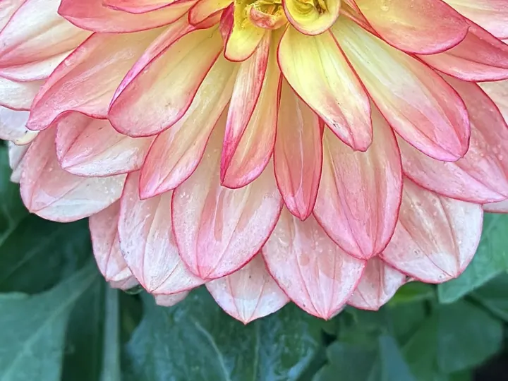 大丽花缀着雨珠,粉与黄的渐变花瓣像被雨水润过的糖霜,层层叠叠间,每一颗水珠都成了晶莹的缀饰,把雨后的清新与花的柔美一起展现出来。