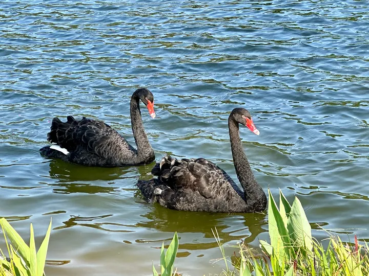 黑天鹅在水面悠然游弋,墨色羽毛如暗夜织就的绒缎,红喙轻点清波,漾开圈圈涟漪。岸边草叶随风轻晃,与它一同,把这方水域的静谧与优雅,写成了流动的诗。