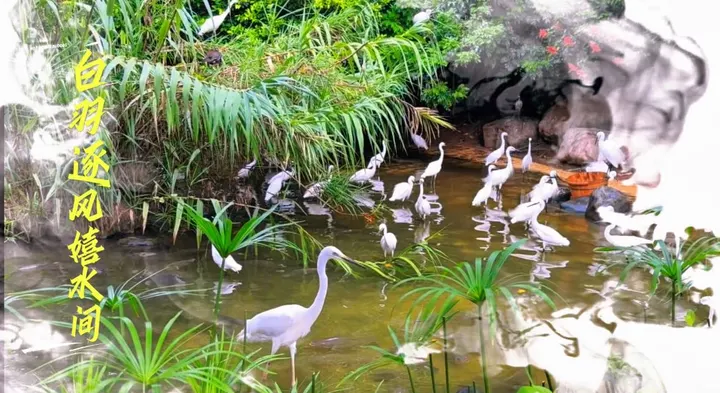 碧水边,白鹭或立或走或展翼,衬着繁茂绿植、点点红花,好一幅灵动自然图。