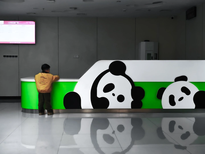 儿童医院的前台两只熊猫可可爱爱,小朋友望着他们,三只身影形成互动关系,好像是三个玩伴在玩耍。
