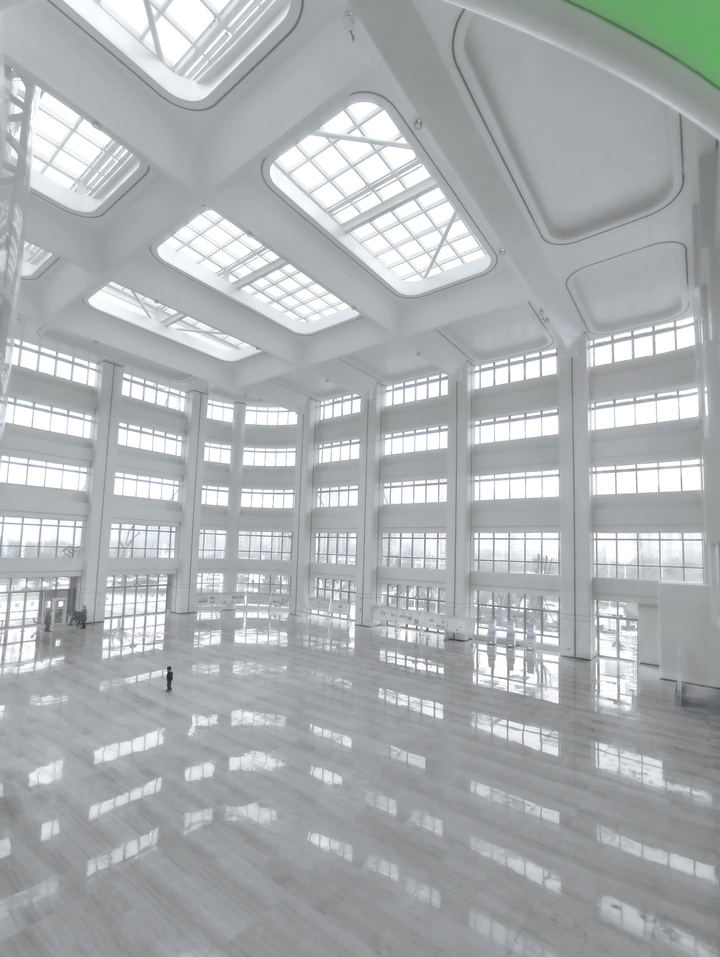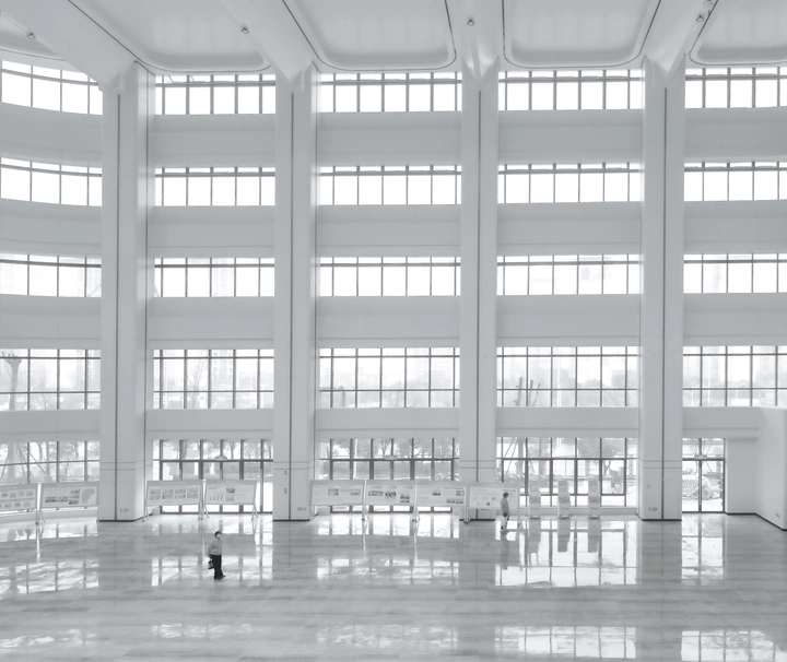 阔大的白色建筑仿佛宏大的天地,而一个黑色身影正身处在这苍茫白色之间。