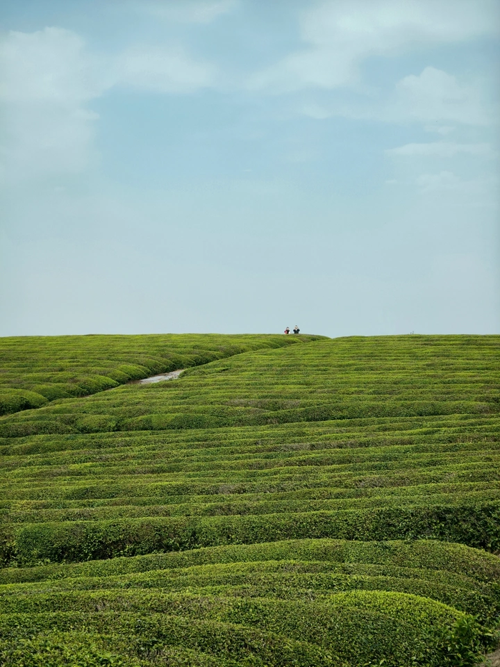 南昌连绵近一个月的春雨实在让人难以真切地感受春天。然而,今天,清明这天,天气难得地晴了。这怎么能忍住不出去踏青,不出去拍照呢? 到了这个千亩茶园,我才真正明白什么叫“铺天盖地的绿”。茶树一垄一垄,整整齐齐地顺着山坡爬上去,像一块巨大又柔软的地毯,一直铺到天边。天是那种透亮的淡蓝,干干净净的,偶尔飘过几朵懒洋洋的云。这蓝和绿配在一起,真是绝了,不用加任何滤镜,镜头里就已经是满满的生命力。 今天,也许我拍到我的手机壁纸。
