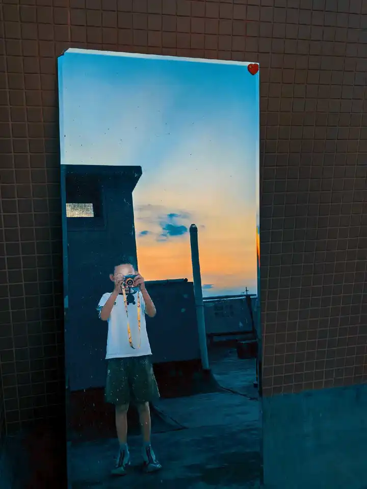 在主题原创性上,自拍在镜子中这一想法较为常见,但结合夕阳这一时间段,增添了新的视角和思考,提升了整幅作品的趣味性。情感共鸣上,镜子所反射出的不仅是摄影师的影像,更多地引发了观众对自我认知和日常生活的思考,形成了一种连接与共鸣。