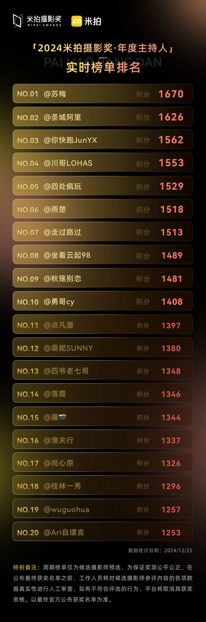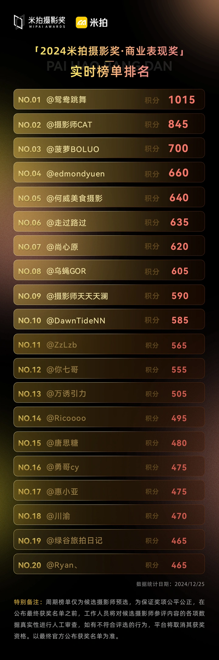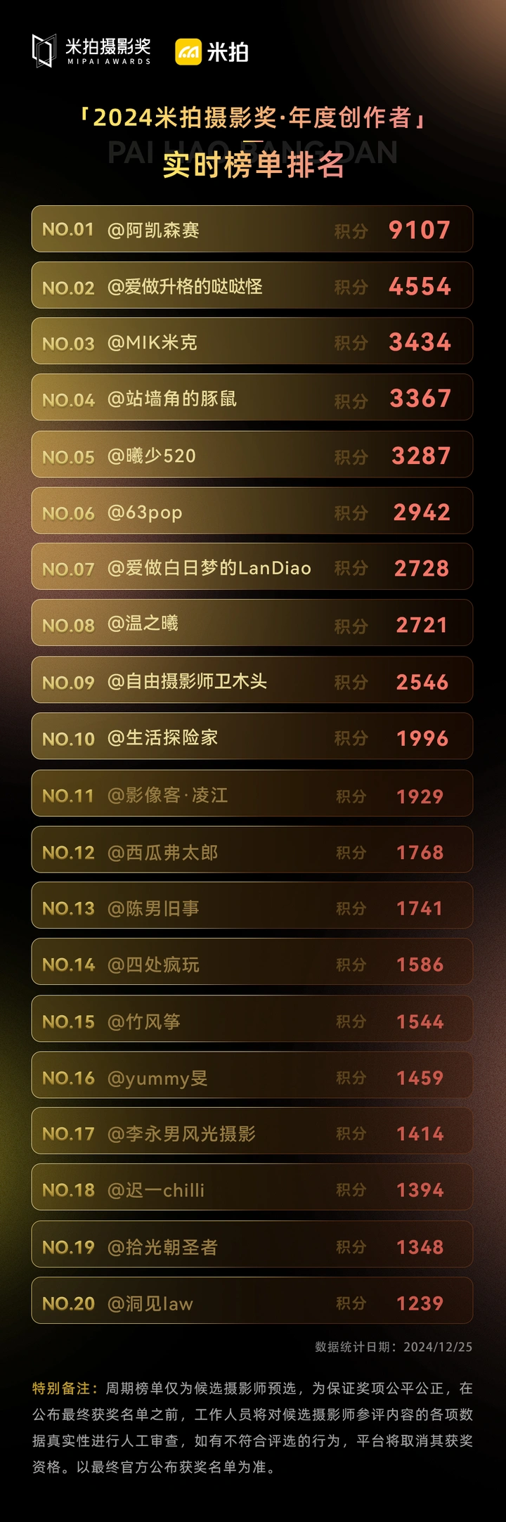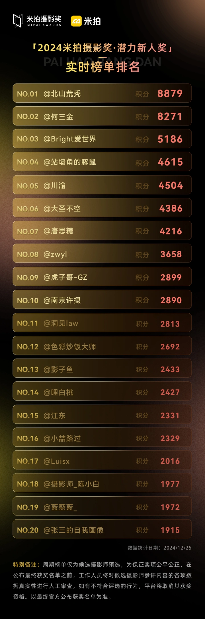 *特别备注*:周期榜单仅为候选摄影师预选,为保证奖项公平公正,在公布最终获奖名单之前,工作人员将对候选摄影师参评内容的各项数据真实性进行人工审查,如有不符合评选的行为,平台将取消其获奖资格。以最终官方公布获奖名单为准