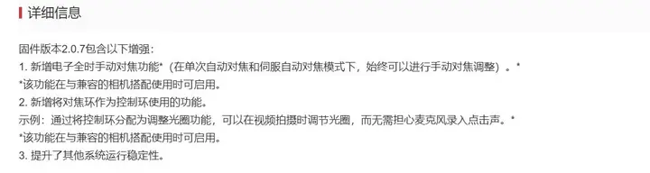 佳能发布RF24-105mm F4L IS USM镜头2.0.7版固件。本次更新新增电子全时手动对焦功能,并支持将对焦环设置为控制环使用,比如在拍摄视频时将控制环设置为调整光圈功能,拍摄时调节光圈无需担心麦克风录入点击声。