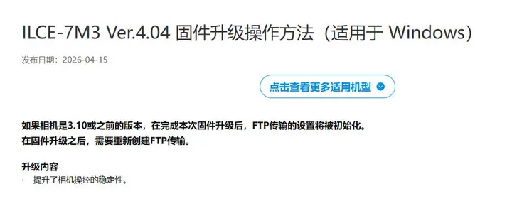 【索尼推出A7M3、A7C及A7R4a最新版本固件!】 索尼近期为全画幅微单A7M3、A7C及A7R4a推送新固件,主要提升相机操控稳定性。以上机型用户可前往索尼官网了解升级详情。