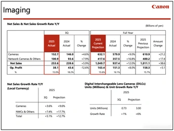 【关键信息!佳能四季度要加大促销力度了】 佳能发布 2025 年第三季度财报,营业额同比增长 2.3% 达 1.1 万亿日元,创同期新高,但营业利润受关税及重组费用影响下滑 10.3%,关税单季致利润减少 79 亿日元。 核心增长动力来自影像业务,APS-C 画幅专微相机 EOS R50、R100 等入门级机型销售坚挺,在中国及周边地区增长强劲,网络摄像机也以美国市场为中心实现增长。印刷业务虽受关税拖累,但整体需求仍存。 展望第四季度,佳能计划加大促销力度,聚焦热门机型持续发力,力争实现全年销售额同比两位数增长,以对冲全球经济下行及关税带来的不确定性。