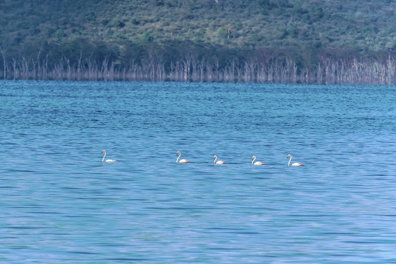 非洲肯尼亚那库鲁,一排火烈鸟,如巡航舰在湖中荡漾。 我是资深野生动物摄影师Fischer,我每年带队去非洲拍摄野生动物。