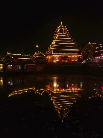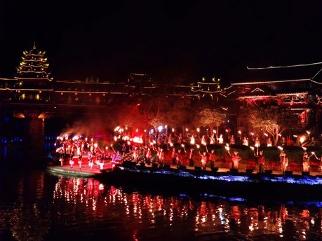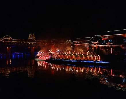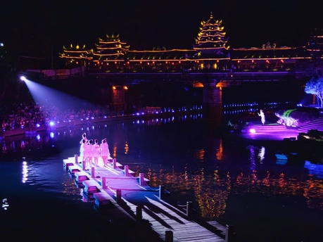 家乡的夜色,一场大型侗寨山水实景演出,其名为《戊梁恋歌》,在绚丽的灯光布景和悠扬的民族音乐中,戊梁山下侗寨阿妹肖女和侗家后生闷龙哥相知、相爱、恋别、守望,上演了侗家爱情的绝唱,展示了侗家人“饭养身,歌养心”的文化氛围,刻画了侗族人民勤劳质朴的精神品质。