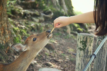当年和女票去奈良,和大鹿小鹿的互动特别多。 这张是我最喜欢的一张,抓住了一边小鹿抬头吃下鹿饼干的那个瞬间,一边是女票雪白额手臂,二者带着对比色相交于画面中央