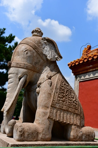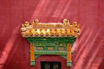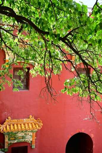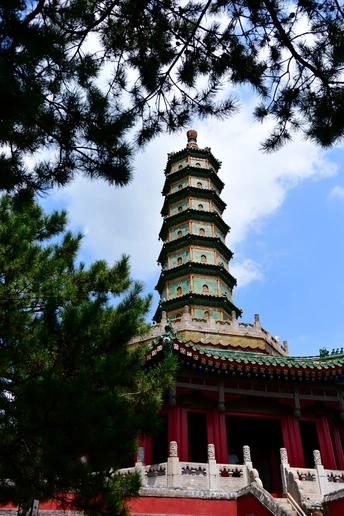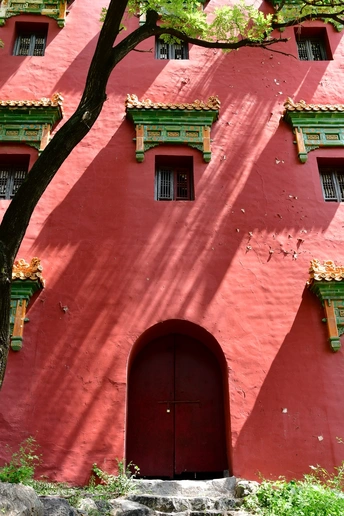 须弥福寿之庙又称班禅行宫。 1780年,西藏六世班禅为了给乾隆皇帝庆贺七十大寿,不惜长途跋涉,从日喀则扎什伦布寺启程,历经一年又两月,行程两万多里来到承德。 为了迎接他的到来,乾隆皇帝仿照日喀则扎什伦布寺修建了这座行宫,供六世班禅讲经和居住。 所以,须弥福寿之庙又称小扎什伦布寺,是外八庙里落成最晚的一座,乾隆在《须弥福寿之庙碑记》中写道:“布达拉既建,伦布不可少。” 院落里古木参天,行宫倚山而建,步步登高。跃上三处不规则的石级,一座高高矗立的三间四柱七楼的汉式琉璃牌楼,分外显眼。 据说牌楼仿北京北海公园小西天的牌楼所建,红墙黄瓦,绿色花柱。 牌楼前面镶嵌的白色石额上刻着乾隆御笔金色大字“普门应现”,意为观音显现普度众生之门;后面石额上刻的是“莲界庄严”,意为观音道场。 牌楼前为月台,周遭砌“女儿墙”。正中及左右三面为石阶步道,正中步道两旁,巍然屹立着一对比女儿墙还高的石狮子,远看好似笑一般模样。狮子乃百兽之王,汉传佛教喻其为佛陀之勇猛和精进,被当作吉祥瑞兽,也是权势和财富的象征。