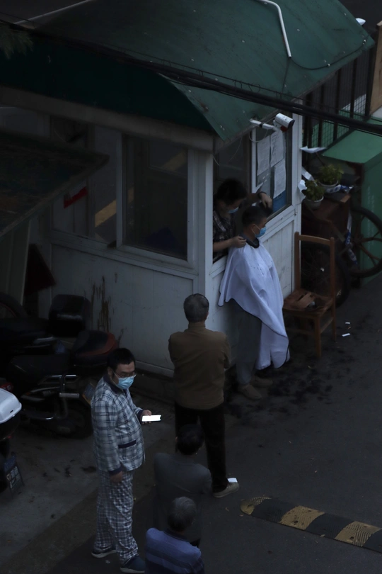 这张照片拍摄于2022年四五月份时期的上海。 这期间小区因为特殊原因被封控,居民们只能在小区内活动。 一天,小区内原本废弃的岗亭前,突然排起了长队。 这是居民自发组织的理发队伍,岗亭内的理发师给前来排队的居民们,剪起了头发。