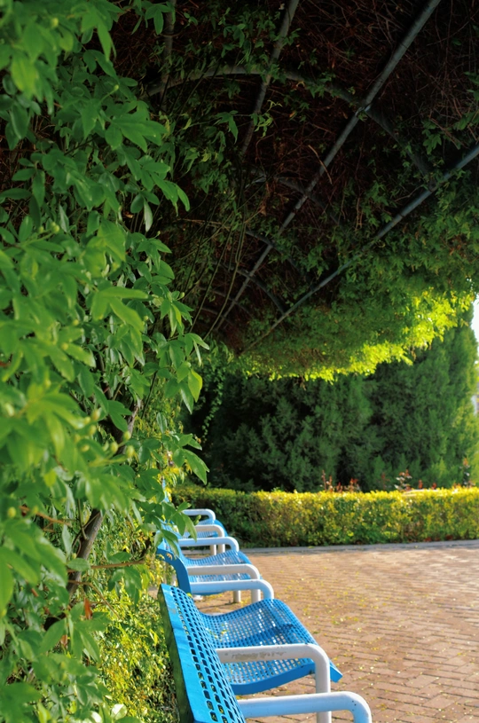 清晨,第一缕阳光洒进公园,透过茂密的绿茵洒在长椅上,充满了宁静祥和。