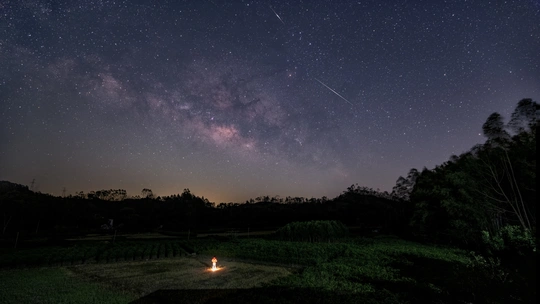 老家稻田里的银河和流星, 对着滑过的流星许愿。