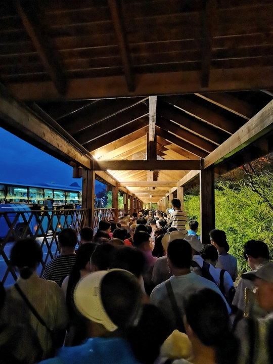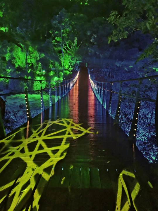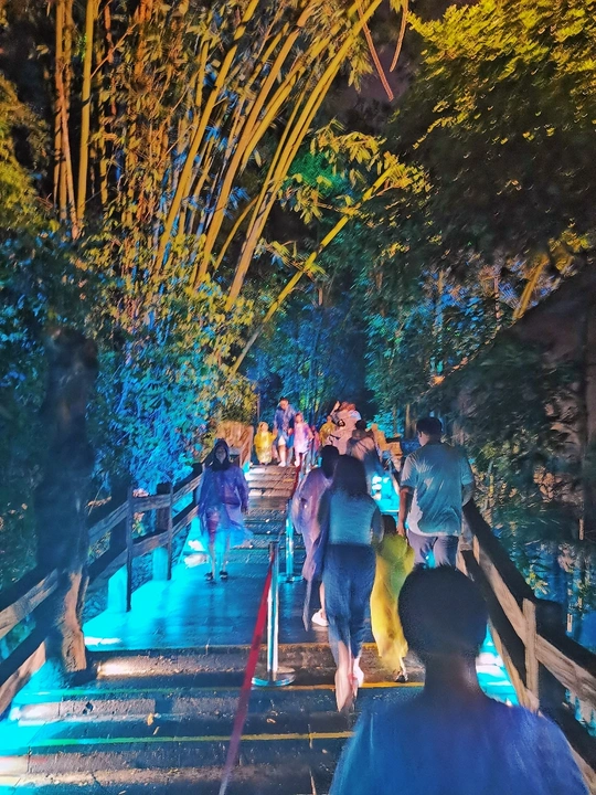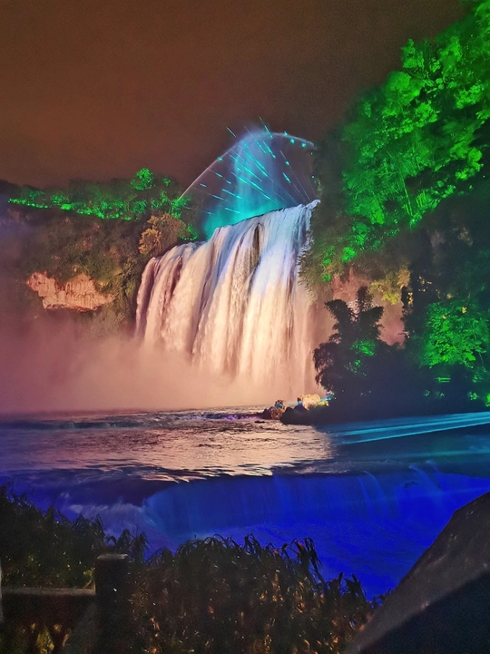 🌟在一个夜幕降临的晚上,我来到了黄果树瀑布的夜游景区。 🔻虽然我早有所闻,但当我亲眼目睹瀑布在灯光的照耀下,那美轮美奂的景色仍然让我叹为观止。 - ☔️当我来到瀑布景区时,排队的人们络绎不绝,即便雨水紧密地编织成一片雨幕,他们的热情却仍然不减。 🔻大家拿着各式各样的雨伞,一边排队等待,一边与朋友们聊天开心。 - 🎶蔚蓝色的天空被一场夜雨所掩盖,但并不影响我们欣赏舞蹈表演和灯光秀。 🔻歌声在雨中回荡,我们伴随着音乐的节奏,并用手指点点头跟随着旋律摇摆。 - ⛰沿着山间的电梯和竹林,我们穿过一根根竹枝间的洞穴,终于到达了瀑布的最佳观赏点。 🔻当音乐响起时,黄果树瀑布在灯光和音响的映衬下时隐时现,仿佛置身在仙境之中。瀑布慢慢地从山上倾倒而下,犹如白色的丝带般优雅地撒向山谷,水花与灯光交相辉映,犹如星星点点跳舞起舞。 - 🌉而横跨河流的吊桥,连接着观众们与瀑布的情感,给整个景区增添了一份别样的魅力。 🔻吊桥上的灯光闪烁,散发着各种色彩,让人如痴如醉。我沿着吊桥漫步,雨水轻轻打在脸上,清凉而又舒适,仿佛与大自然融为一体。 💦