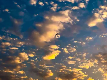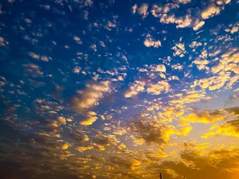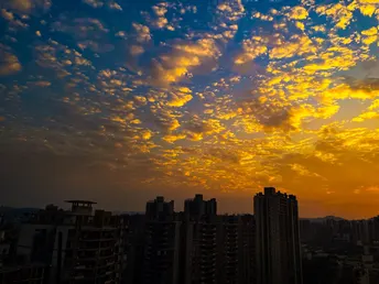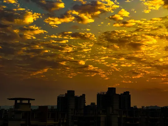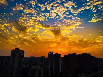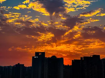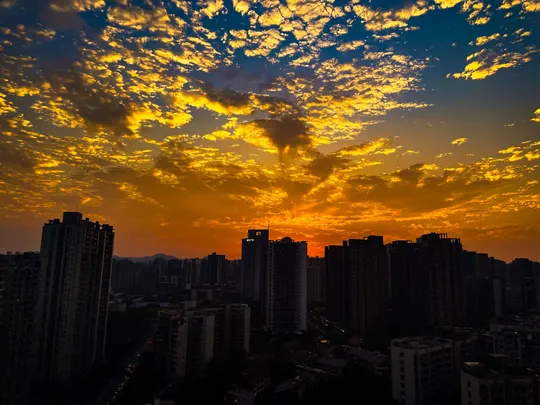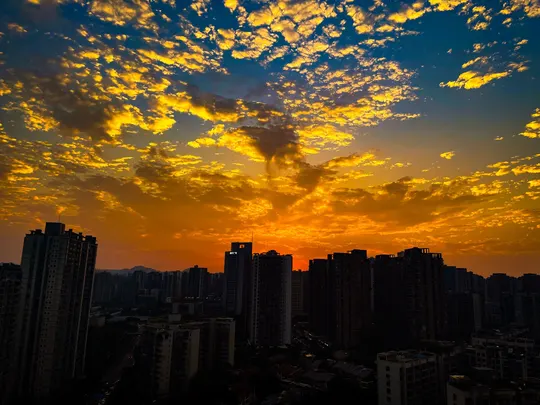 站在楼顶上看到的晚霞,彩云满天,霞光辉映。