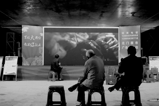 社区的电影舞台集成,老人晚间的休闲活动,电影百姓舞台,一杯茶一个凳子就是一个回忆
