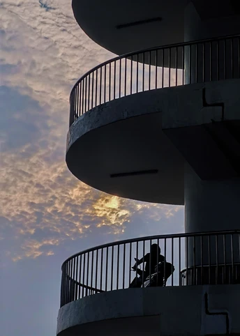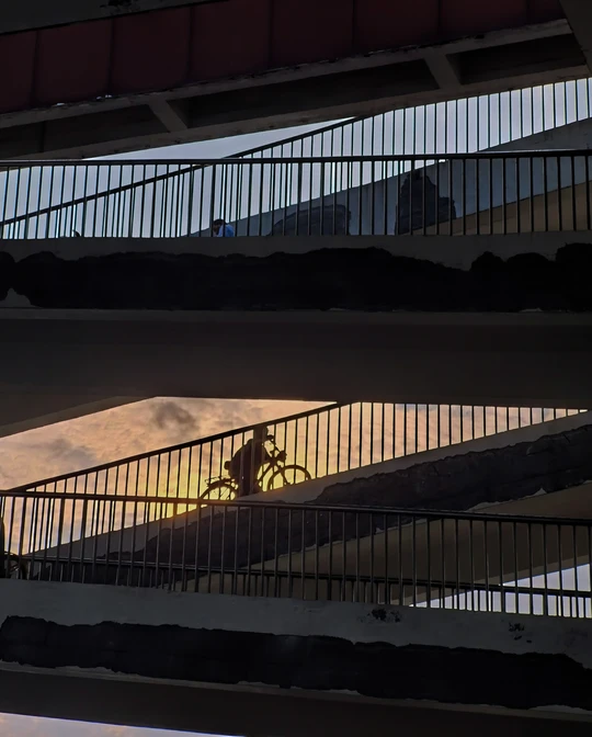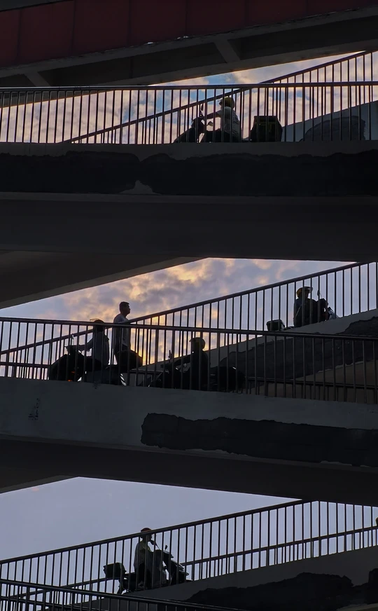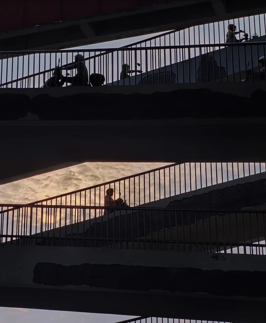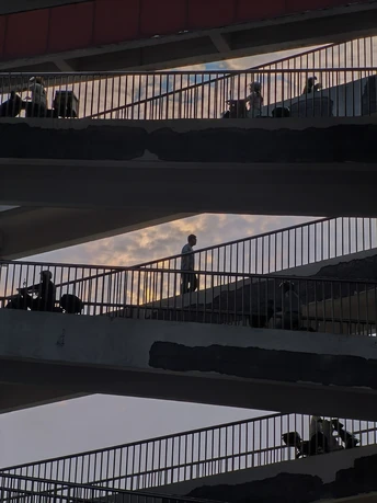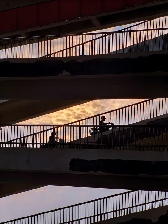 大桥的桥头堡的人行道,下班的人披着夕阳归家,一幅动态夕阳图。