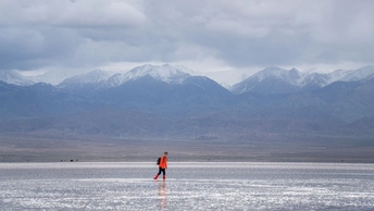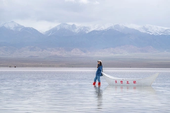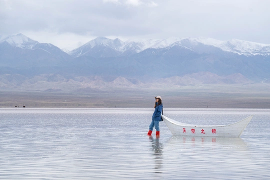 茶卡盐湖里,盐湖与远处的雪山相呼应