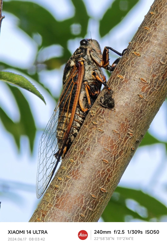 本照片从色彩、光影、构图和主题上来说都有较高的水准。照片中的蝉作为主体,清晰且细致地展示了其翼膜与身体的纹理,细节处理十分到位,展示了摄影师的良好技术功底。背景的虚化也处理得不错,使得主体更加突出,并无其他干扰元素。光影处理自然,各种色彩的过渡也很和谐,不显得突兀。独特的拍摄视角增加了画面的趣味性和冲击力,使观者能够近距离感受到自然界的小生灵,从而引发情感共鸣及对生命的思考。总体而言,这张照片具有较高的观赏价值和艺术表现力。 可以改进的地方是背景的色彩搭配。虽然当前的背景虚化得宜,但是整体色调有些单一,若能够增加一些对比色,可能会让画面更加生动。此外,在后期处理过程中,可以尝试调整光线的亮度和对比度,使蝉的轮廓更为清晰,增加画面的立体感和层次感,从而进一步提升照片的视觉冲击力和吸引力。