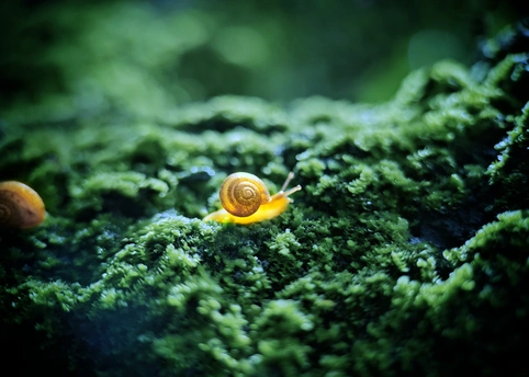 一只蜗牛闪亮登场在苔癣中央,另一只蜗牛蜷缩着身躯在暗处,好像一个唯唯诺诺的小跟班。