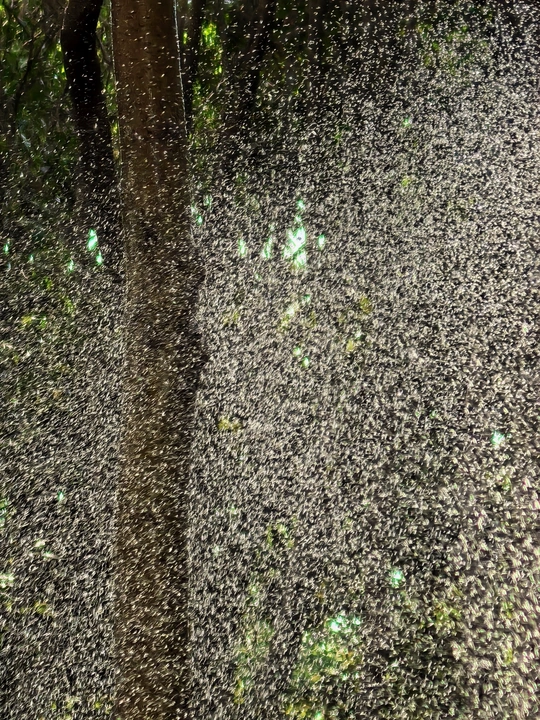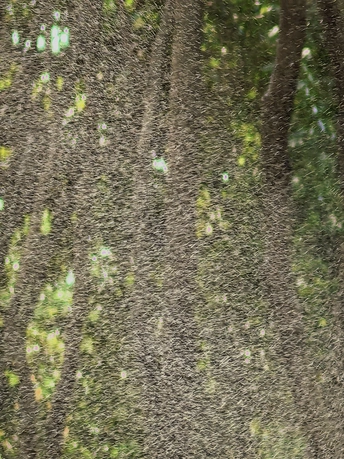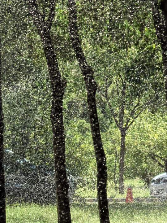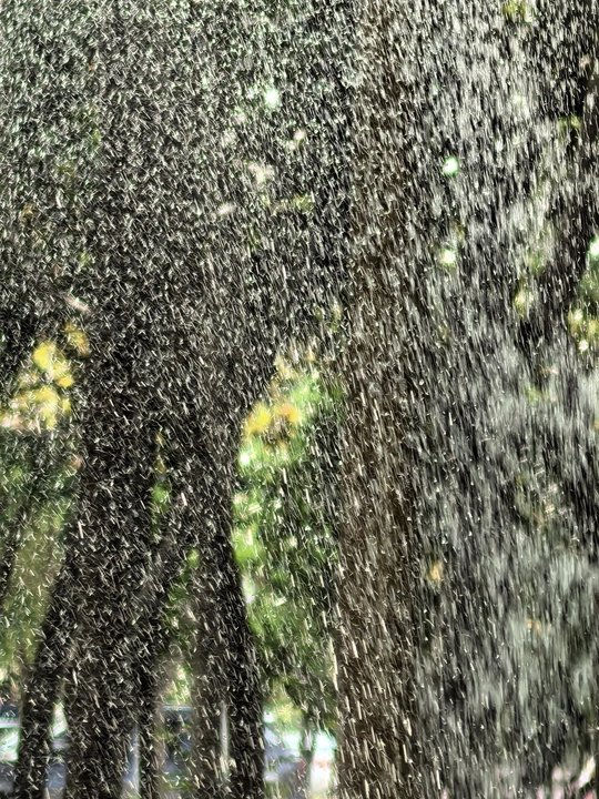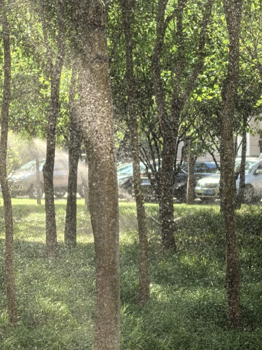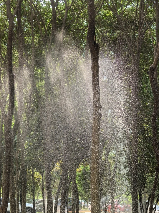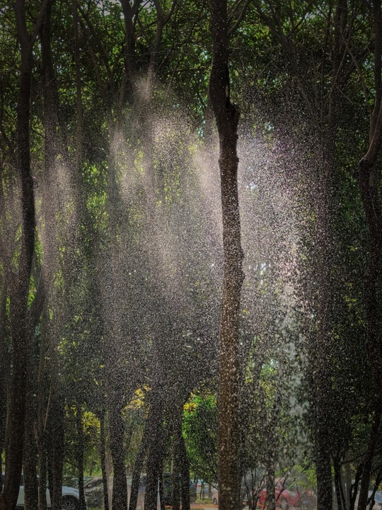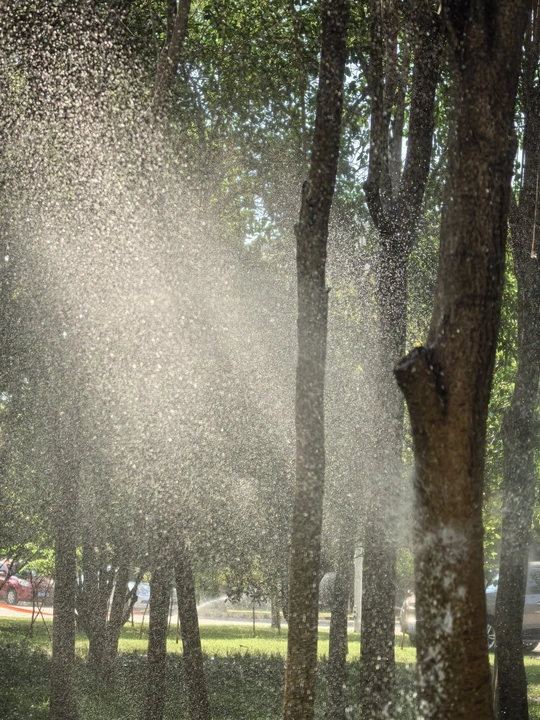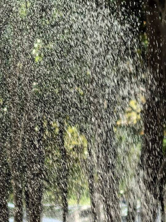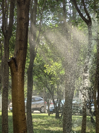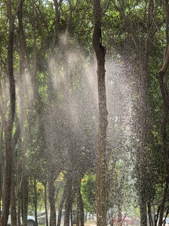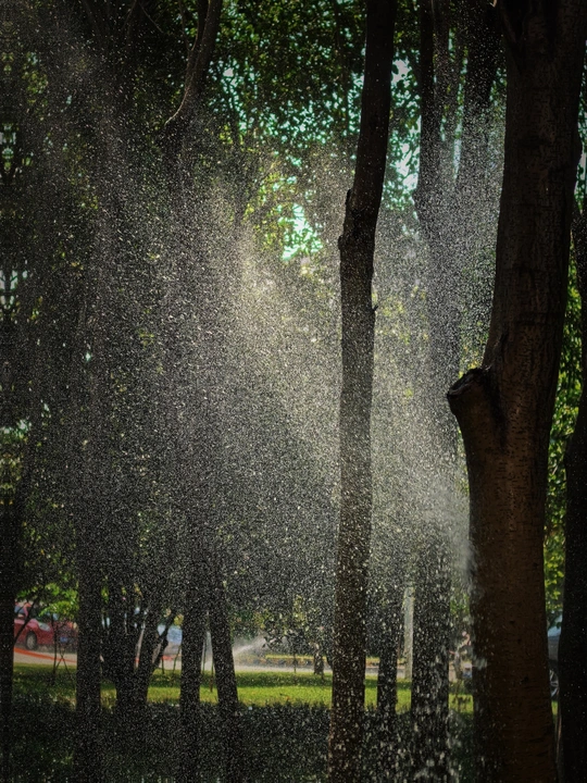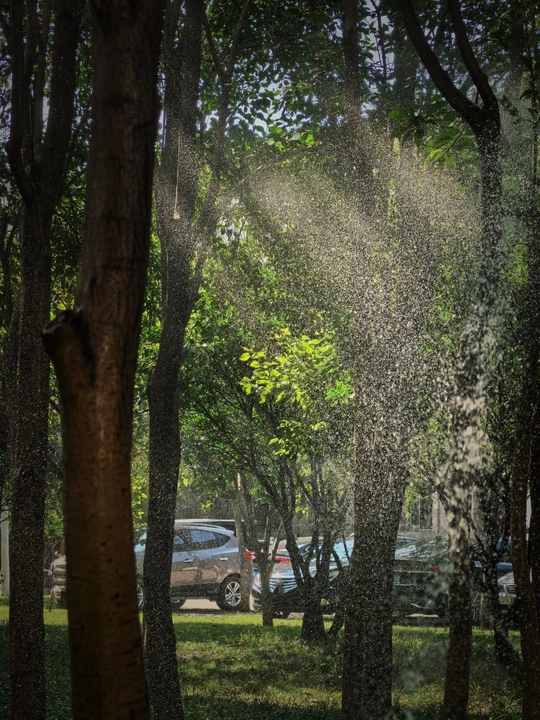 园丁在给花草树木浇水,水柱被树干击散,又被阳光穿透,形成了美丽的光束,一幕水光电影在此上映《水舞光蹈》。