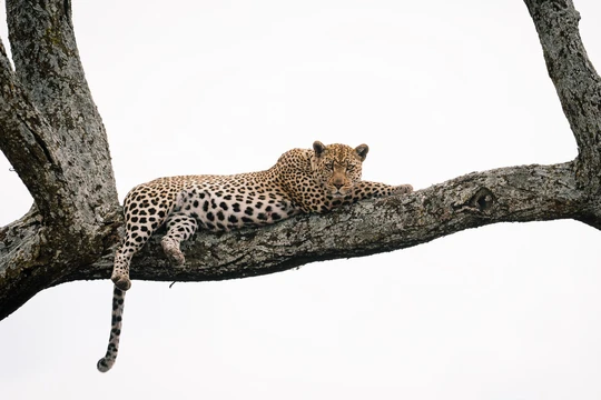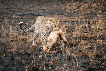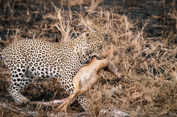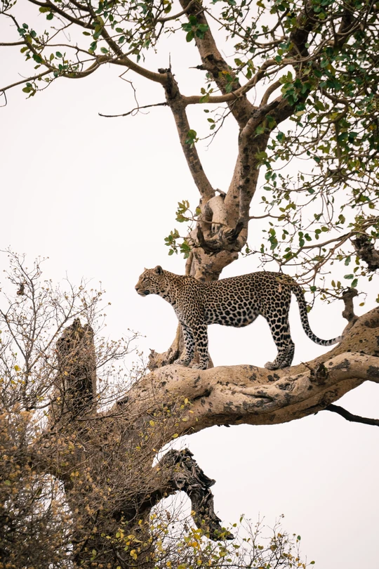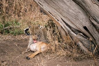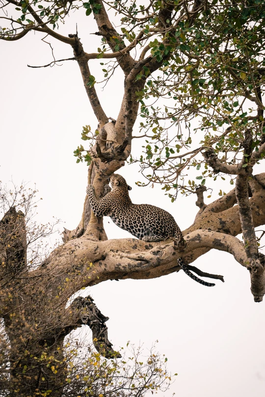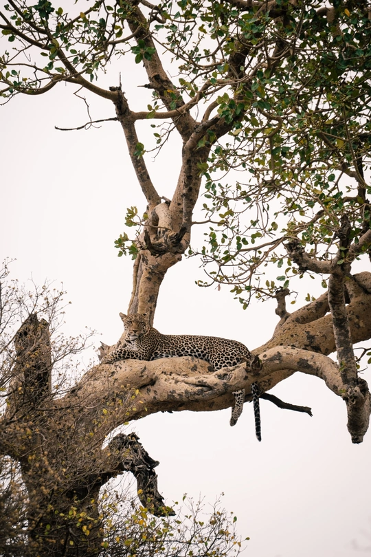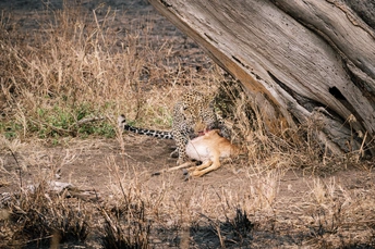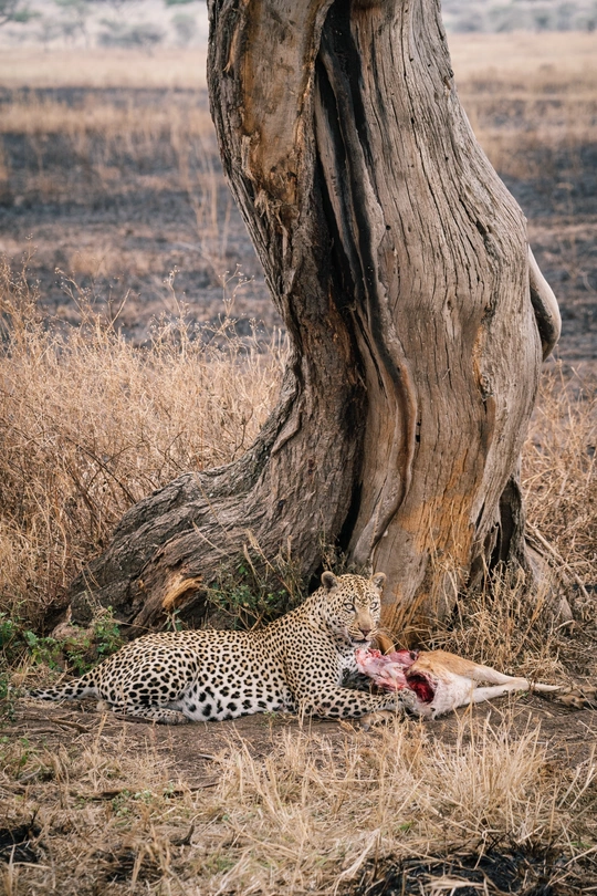清早路过了一片烧焦的土地,这是保护区的工作人员特地烧的,这样可以更快长出新的青草。在焦土中间有一棵斜着的树,树形很独特,我们贴着树旁边的小路过去想拍一拍树,突然发现,树上趴着一只花豹。在小心地经过时,突然有一个黑影从树上掉了下来,仔细看居然是半只羚羊。几乎是同时,树上的花豹一跃而下,她警惕地看了一眼车子,叼起羚羊慢悠悠地走回了树下,原地开始了早餐,花豹的注视真的非常有威压,感觉她下一秒就要把我的喉咙咬开。在傍晚又在另一棵树上,看到了另一只花豹。