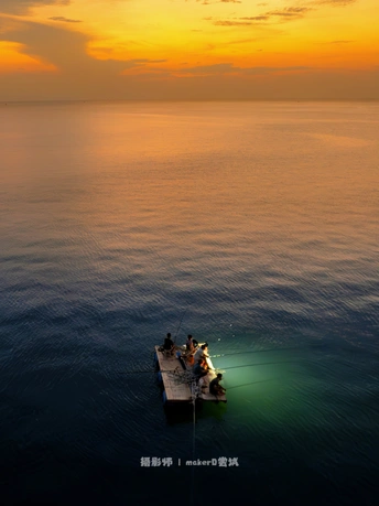 落日烧红了天空,也烧红了大海,孤独的海板上,几位钓手静静地等待着鱼儿的上钩。